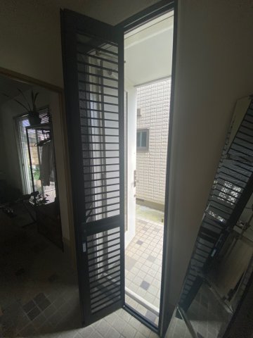 ご提案しました玄関ドア用通風スクリーン「リリーブ」はアルミパンチングパネルなので、破れる心配がありません。折戸式なのでスペース的に邪魔にならないという利点もあります。