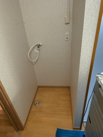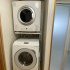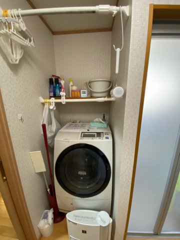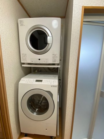 ドラム式洗濯機の上部空間に、専用架台にてガス衣類乾燥機(リンナイ乾太くん8kgタイプ)を設置。
