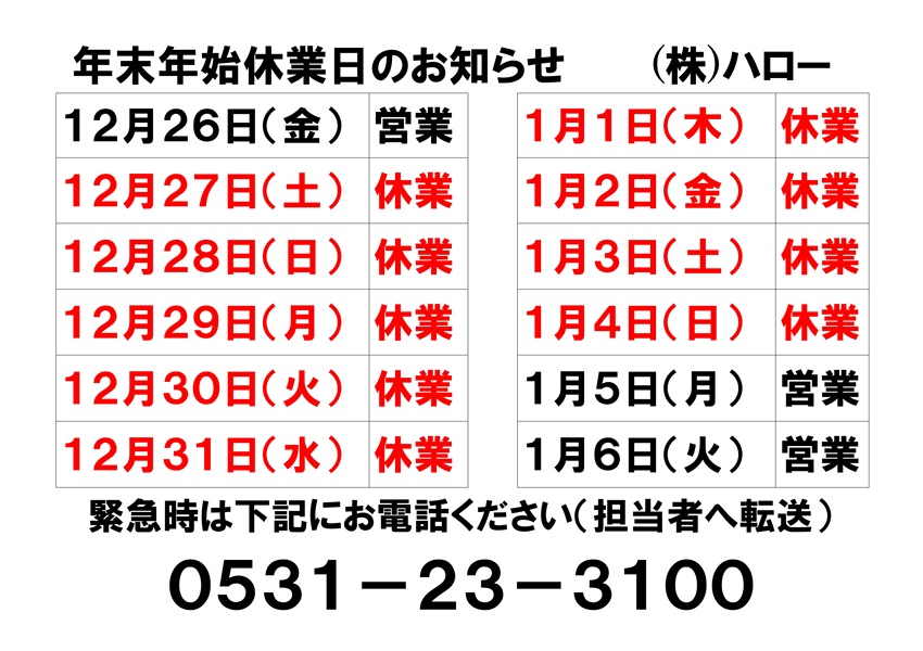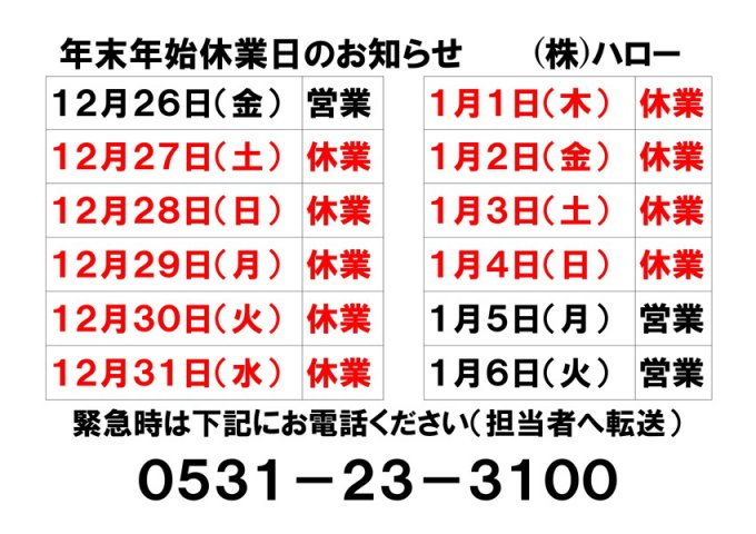 さて、年末年始のハローの