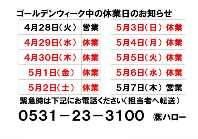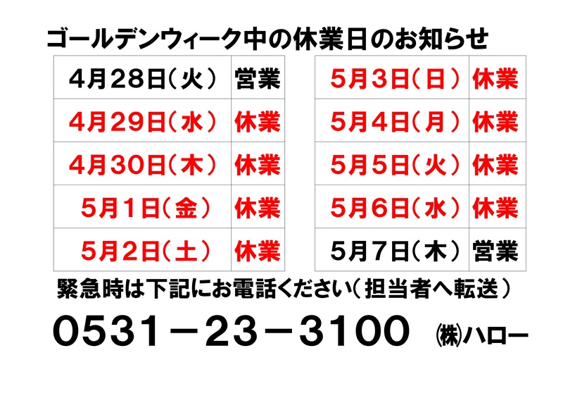 ゴールデンウィーク期間の営業日、休業日のお知らせです。